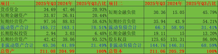巨大的营运资本需求直接导致了海格通信流动性危机出现,进而加大了负债规模,海格通信的负债率大幅提升。按照下图简化之后的海格通信资产负债表来看。海格通信虽然资产账户上面有35亿元的货币资金和34亿元的短期金融资产。现金蓄水池规模达到了69亿元。但是2025年三季度海格通信的营运资本需求达到了60亿元的级别,其中34亿元的短期金融资产中大部分是流动性比较差的投资性房地产。