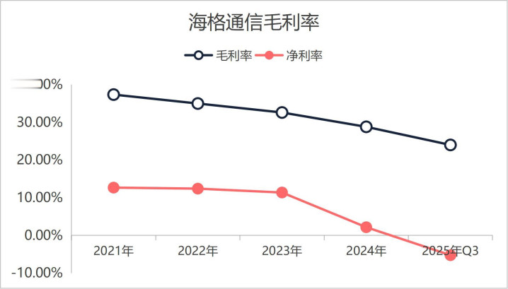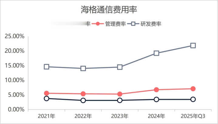 其次是海格通信的综合毛利率和综合净利率进入了下跌趋势,并且综合净利率因为研发费率的大幅提升直接进入看亏损状态。从下图海格通信2021年至2025年三季度综合毛利率和净利率情况来看,海格通信的毛利率和净利率呈现下滑趋势下,毛利率从最高的40%下滑到20%,净利率从最高的10%直接变为负净利率。