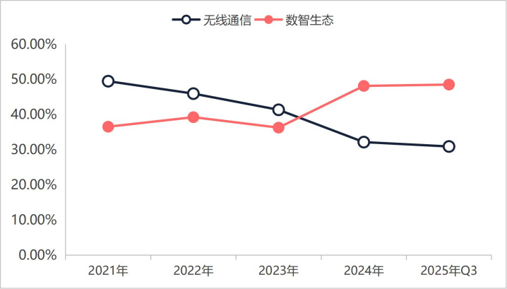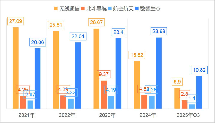 以商业客户为主的无线通信和数智生态是海格通信业绩的主要来源。2023年以前无线通信占营业收入的比重最大,是海格通信业绩的最大来源,2023年之后数智生态业务占营业收入的比重超越无线通信,成了海格通信营业收入最大来源。海格通信数智生态业务成为营业收入的最大收入来源,是不是在下一盘大棋呢?穿透财务报表看看吧!