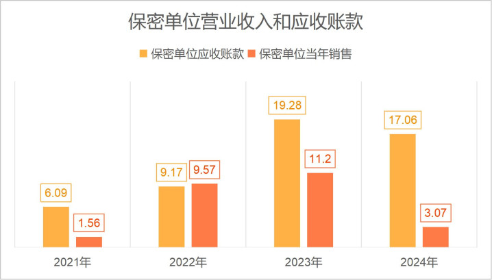 接下来简单看一下海格通信以政府客户主导的无线通信,航空航天和北斗导航这三大业务情况。海格通信的这三大业务由于是政府主导的原因,在没有巨大的系统性变化的情况下,业务规模和成长性是相对稳定的。并且这三大业务主要是通过少量订金和应收账款来销售的。且这些应收账款的账期都比较长。以2024年应收账款结构来看,欠款最大的是保密单位一欠款金额为9.27亿元,保密单位二三四分别欠款3.5亿元,2.27亿元和2.02亿元,合计应收账款规模为17.06亿元,占应收账款的比重为29%,占当期三大业务营业收入的比重为69%,应收账款占比很大,非常典型的应收账款销售。不过由于这些客户都是政府客户信用高,坏账风险很小。