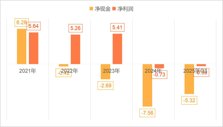 所以,低毛利率的数智生态业务成为海格通信业绩的主要来源之后,海格通信的财务结构出现了逐步恶化的趋势。首当其冲的是经营现金开始恶化。从下图海格通信2021年至2025年三季度经营现金流情况来看,在2023年之前海格通信经营现金流还不错,基本上能达到扣非净利润的水平,但是进入了2023年之后经营现金流净额之后净流出态势。