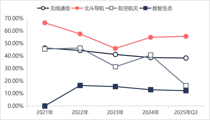 数智生态业务投入大。按照海格通信年报披露来看,数智生态业务是一门高研发投入的生意。直接从海格通信2021年至2025年三季度三大费用率情况来看。海格通信的管理费率,研发费率和销售费率在2023年之前表现比较平稳,但是到了2023年之后三大费用支出大幅上升,尤其是研发费用率直接从以前的15%的投入上升到了25%。