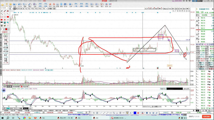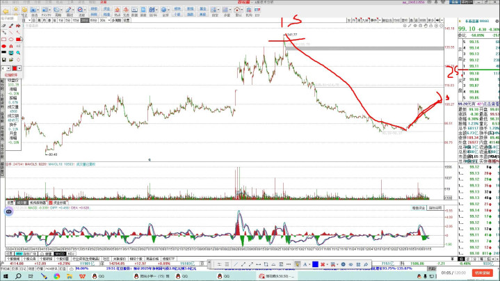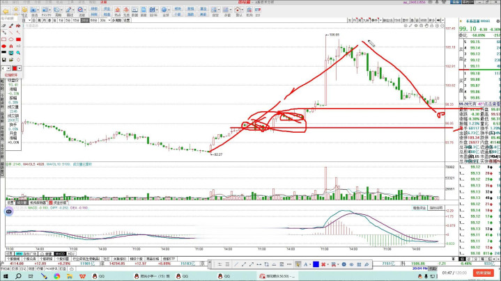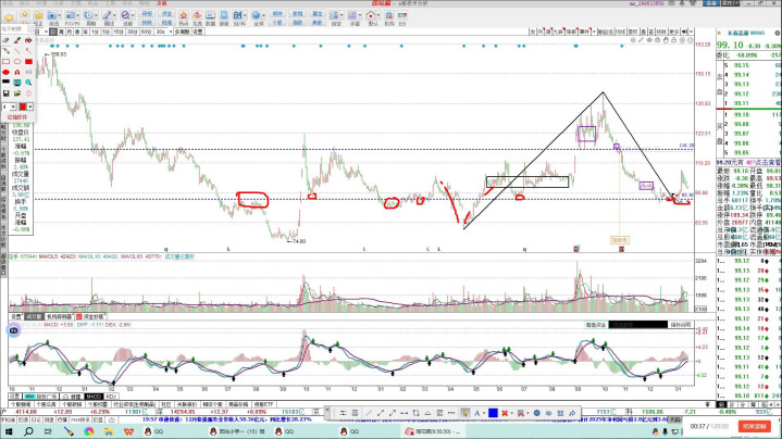 从目前的结构上来说,这笔反弹还没有走完,所以看这笔反弹的力度,从目前来看这笔反弹力度还是比较可以的。最后这个中枢在这,这个中枢也没有构建成三百,三百也没有构建成失败了,所以在回落重点看一下能不能产生二百,这是一个比较关键的因素。