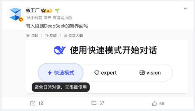 而这些不雅点主要依据近期多样动态的交叉印证。比如DeepSeek官网、APP频繁出现工作中断,就被外界解读为新模子上线前的工作器压力测试。另外有科技博主@蚁工场发现了新界面,其中除了快速、巨匠阵势外,还有一个“Vision”视觉阵势。