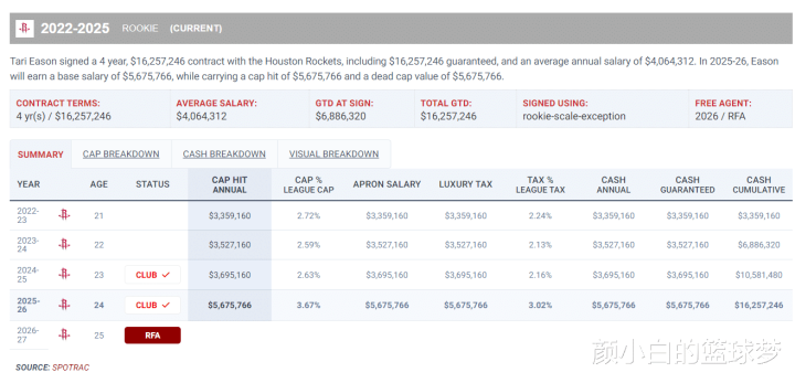 本体上伊森的景色不稳是很故意火箭今夏压价的,瞻望26-27赛季工资帽1.65亿,穷东谈干线1.49亿,糟践税征点2.01亿,第一土豪线2.09亿,第二土豪线2.22亿,火箭队在转正戴维森(给两年左券)后,给伊森均薪低于1800万的左券,今夏就不错不抑遏硬帽。