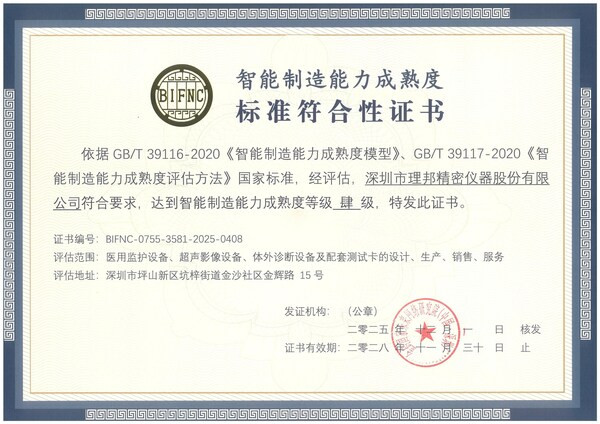 深圳2026年1月21日--在《"十五五"数字经济发展规划》明确智能制造为制造业高质量发展的首要任务的背景下,医疗器械行业迎来制造升级的关键期。依据GB/T39116-2020《智能制造能力成熟度模型》和GB/T39117-2020《智能制造能力成熟度评估方法》两项国家标准,理邦正式通过智能制造能力成熟度四级标准符合性评估,成为深圳首家获此认证的医疗器械企业。
