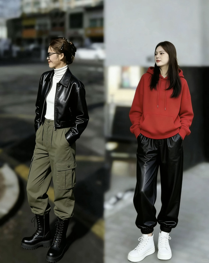 皮质单品都自带帅气属性,比如皮夹克、皮裤等,是女性打造帅气风穿搭的必备,但要作念到于其他单品相王人集,比如玄色的短款皮夹克搭配军绿色工装裤,帅气又即兴干练,聘用玄色马丁靴加多全体造型的利落感,亦能够聘用红色卫衣配玄色束腿皮裤,白色板鞋点缀造型。