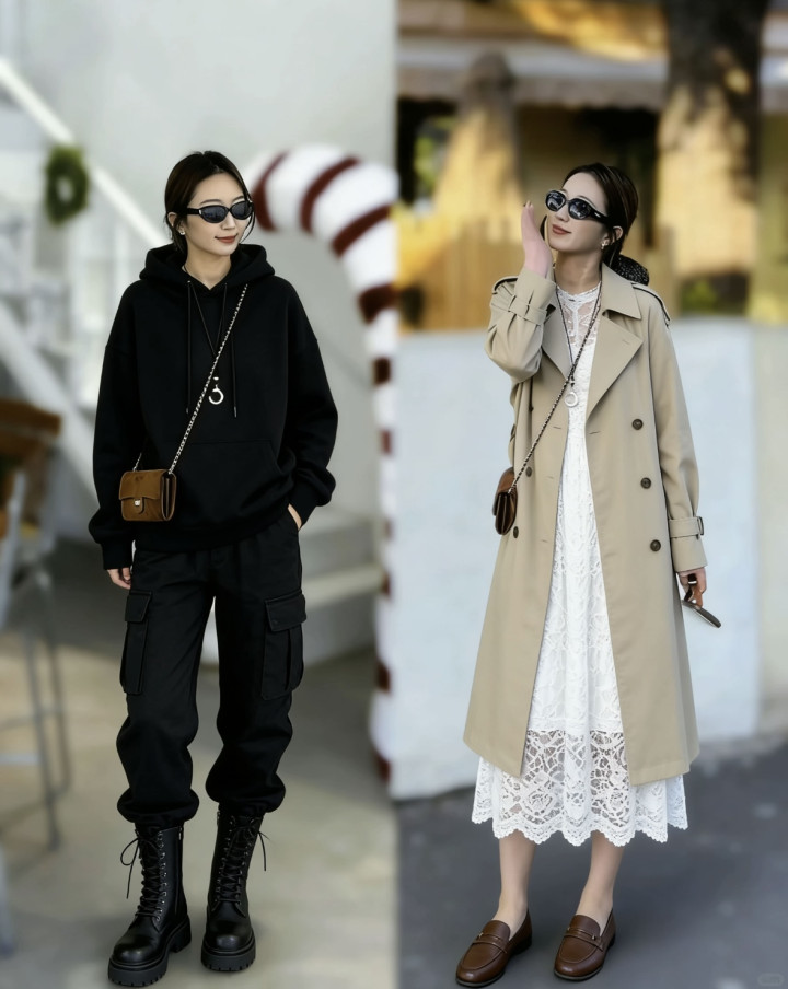 玄色连帽卫衣无间玄色工装璜腿裤+中筒马丁靴,即兴帅气。你看,就算是不同作风的穿搭,并吞个东谈主也不错穿的如斯雅瞻念。