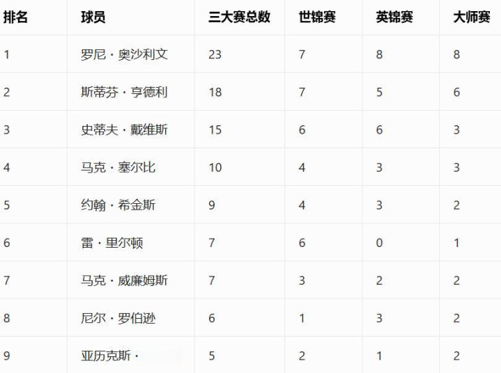 在标记斯诺克至高荣誉的“三大赛”(世锦赛、英锦赛、专家赛)鸿沟,奥沙利文更是汲引了令东说念主气馁的霸权:他共夺得23个三大赛冠军,遥遥最先。现役球员中,排行第二的马克·塞尔比(10个)与之收支13个,这险些是另一座岑岭的高度。