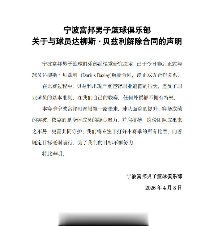 赛后,宁波男篮发布声明,晓示与球员达柳斯·贝兹利打消条约的声明。