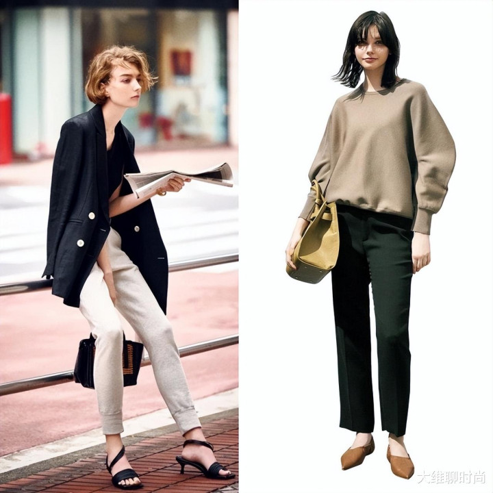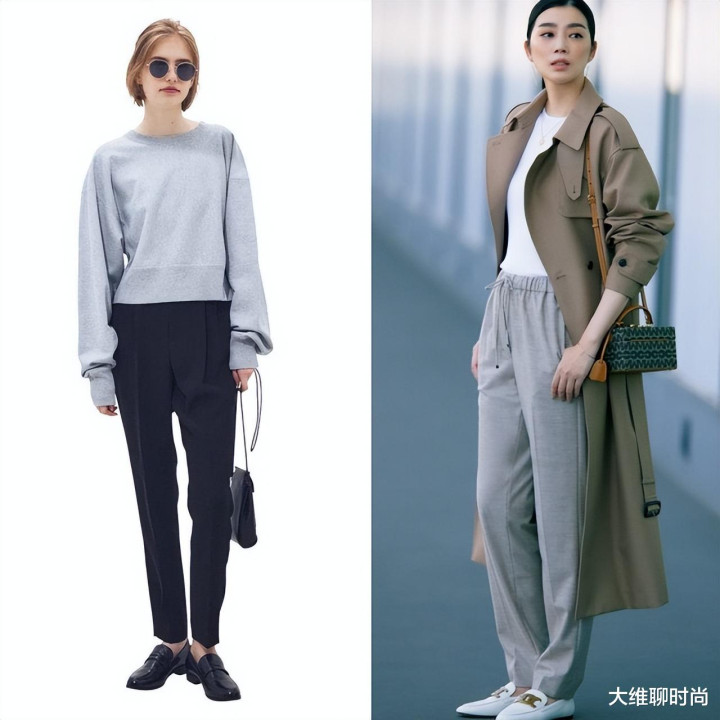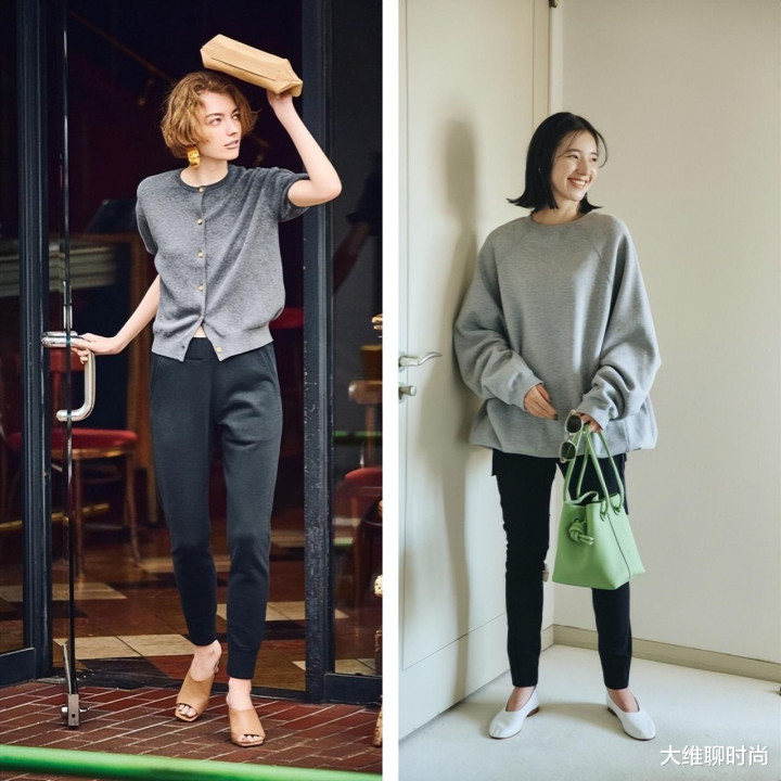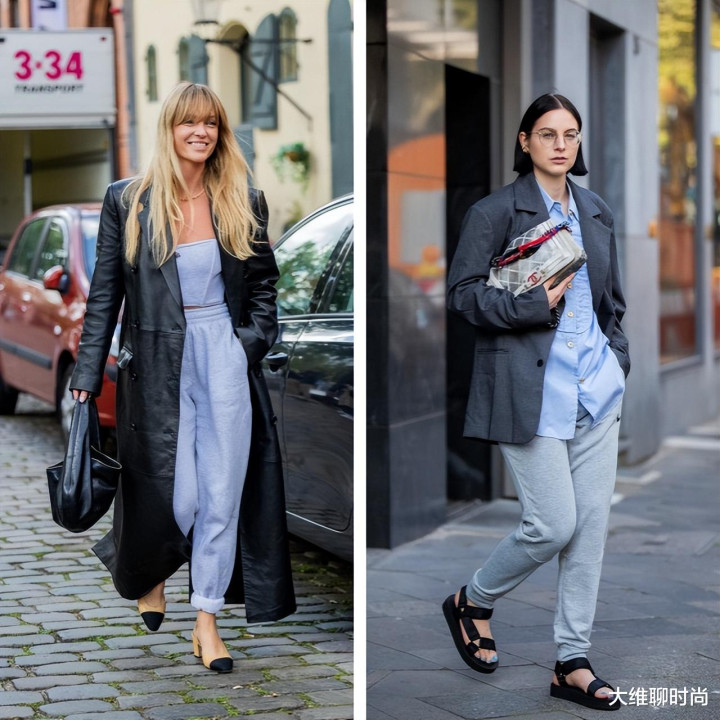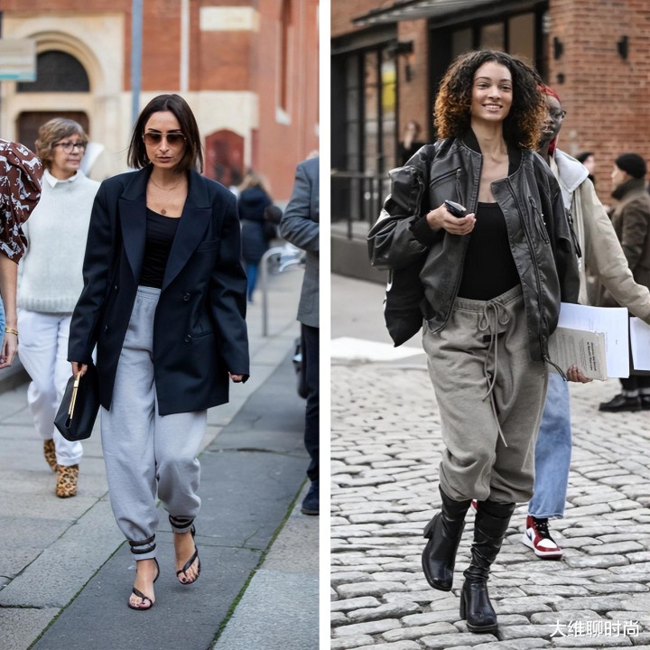 灰色畅通裤搭配oversize夹克,打造王人市感造型。通过内搭和凉鞋清楚肌肤,为闲逸穿搭增添恰到克己的利落感。