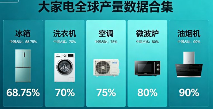 不光雪柜彩电,洗衣机我们中国占全球产量 70%,空调占 75%,微波炉占 80%,油烟机占 90%。