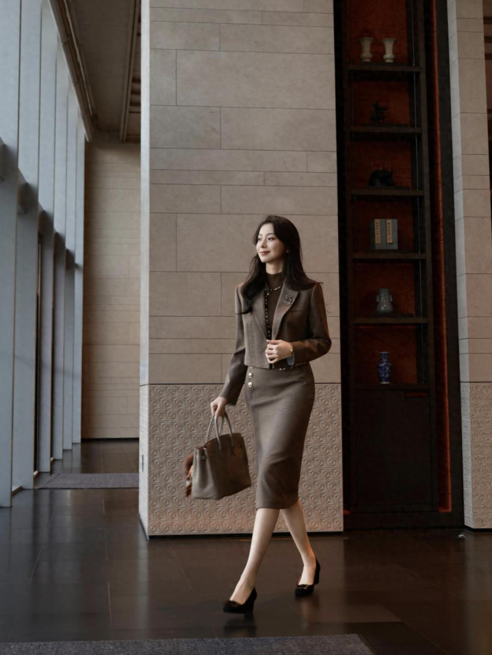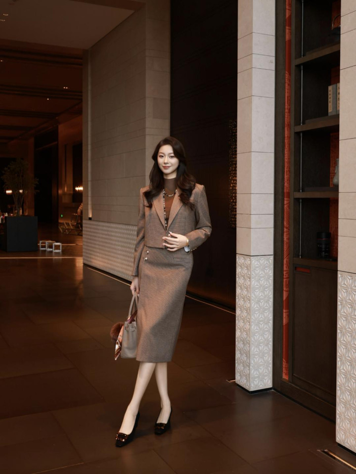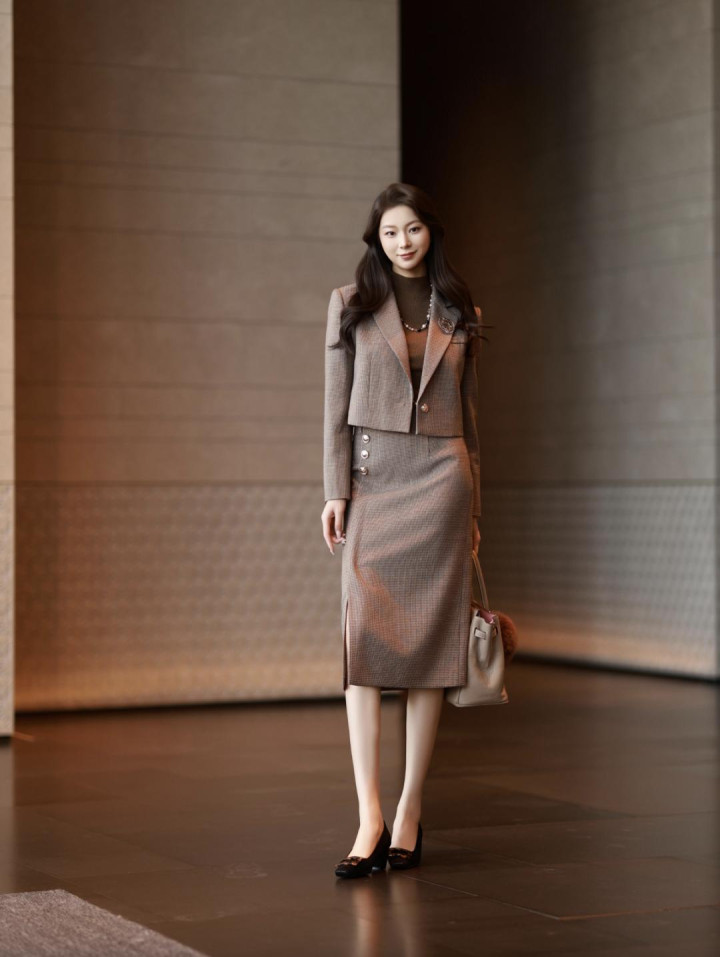 开云app 咖格小西装 + 开叉半裙 + 黑高跟, 职场这么穿, 知性又大气