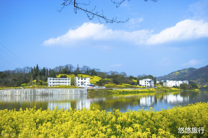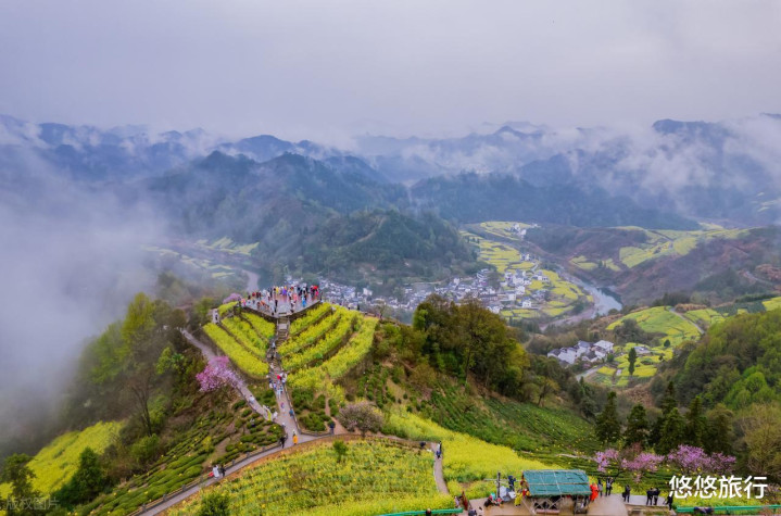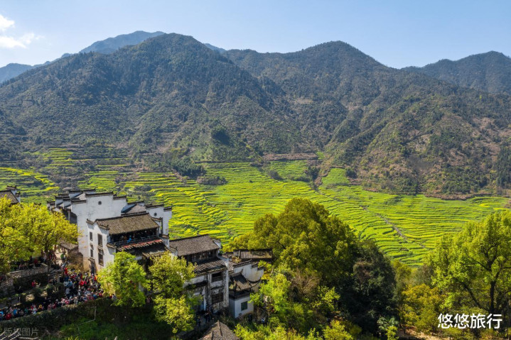 江岭梯田油菜花海,周折的弧线与白墙黛瓦的村庄逸趣横生。察关村石桥仰卧溪上,保留着憨厚的徽州韵味。